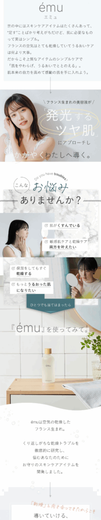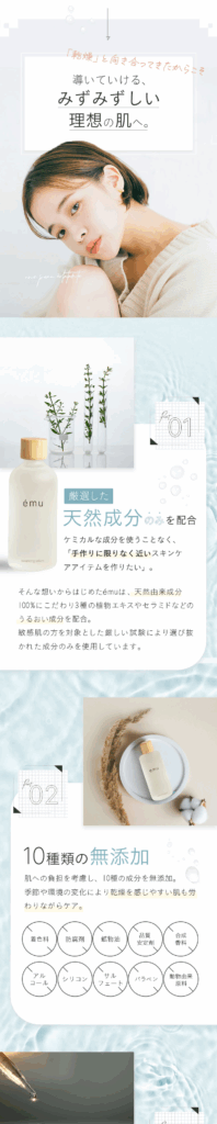 また「低刺激」をポイントに据えるため、デザインのテイストは「ナチュラル×洗練」に。お客さまに”やさしさ”を訴えかけるため、カラーをベージュやグレーなどの中間色にしました。フォントは線の細いものにすることで女性らしい柔らかさの演出ができる構成。